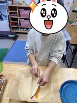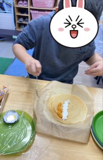 クレープはクリームを絞りトッピングに挑戦!