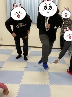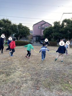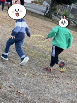 フラフープおにごっこは手をつなぐ変わりにフラフープを掴んでもらいました。