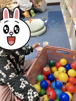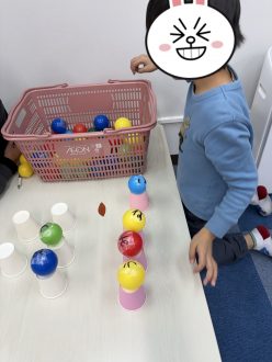 活力(文字探し)ボールについた文字をカゴの中からお題に合わせて見つけ、並べてもらいました。